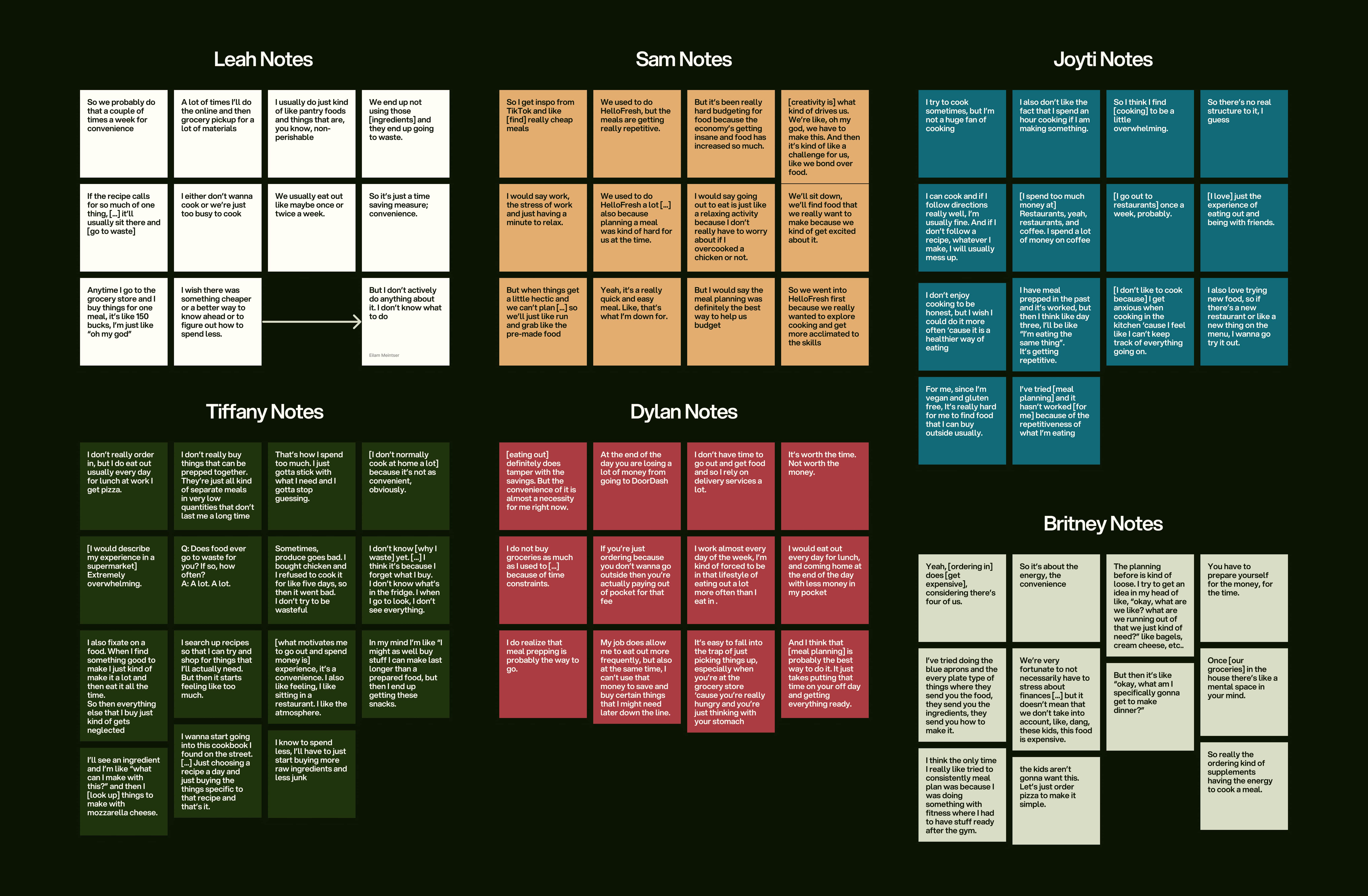 I went on to conduct semi-structured virtual interviews with a group of 6 independent adults who eat out at restaurants at different rates, some more than others, to get to know what it is that makes them gravitate towards ordering Uber Eats, or getting take-out rather than cook at home